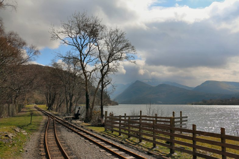 Railway, lake and mountains